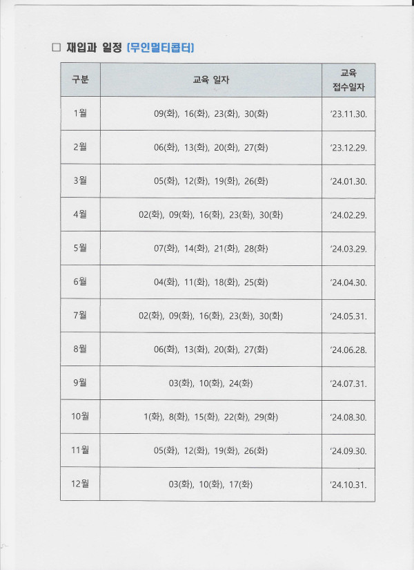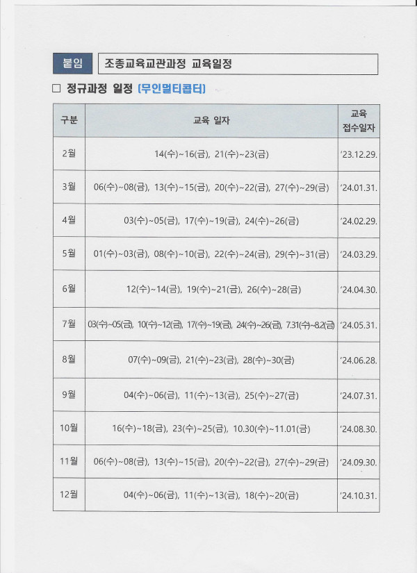 2024년 조종교육교관 입과 일정표 페이지 정보 작성자 애플드론관리자 댓글 0건 조회 661회 작성일 24-01-25 11:30 본문 □ 기타사항 - 숙식 제공 없음(개별적으로 인근 숙식업 이용) - 신분증 및 필기구 준비 □ 신청 사이트 https://www.kaa.atims.kr/ 항공교육훈련포털 목록 답변 이전글2024년 실기평가과정 교육일정표 24.01.27 다음글2024년도 초경량비행장치 학과시험 & 실기시험 일정표 24.01.25 댓글목록 댓글목록 등록된 댓글이 없습니다.